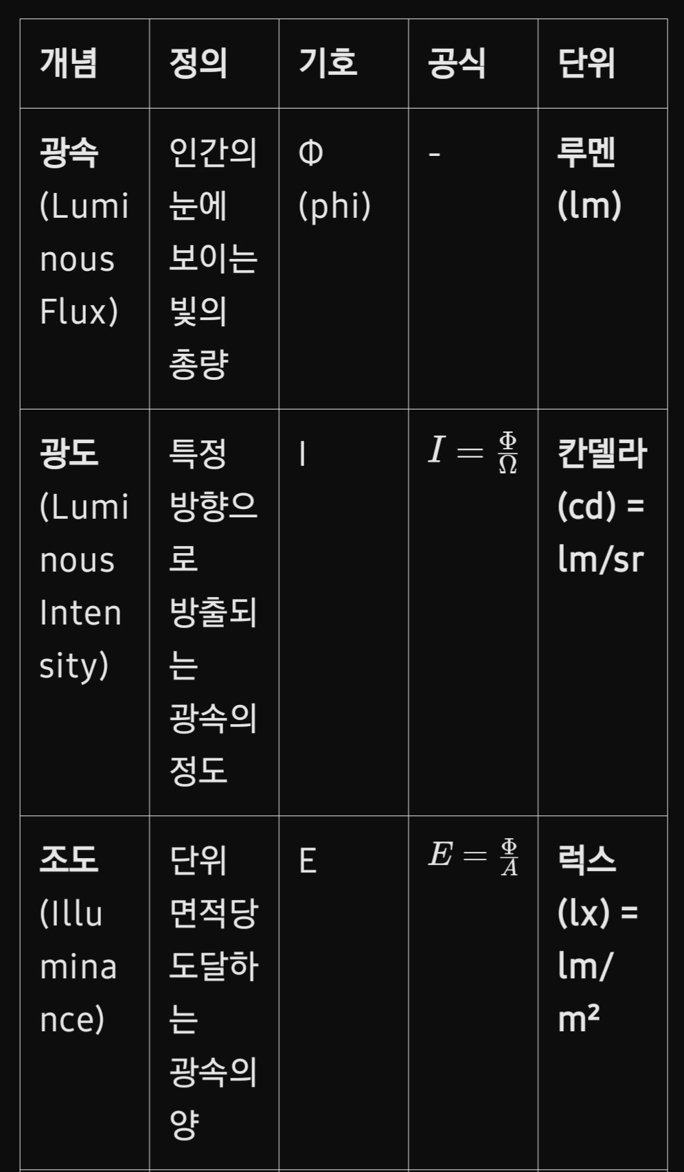 광속(Φ, 루멘 lm), 광도(I, 칸델라 cd=lm/sr), 조도(lx, 럭스 E=lm/m²), 휘도(L=cd/m²) 의 정의 및 관계